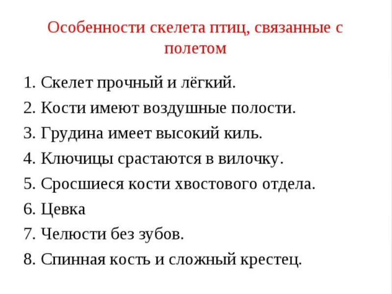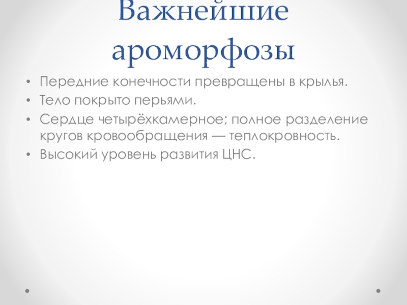 Важнейшие ароморфозыПередние конечности превращены в крылья.Тело покрыто перьями.Сердце четырёхкамерное; полное разделение кругов кровообращения — теплокровность.Высокий уровень развития