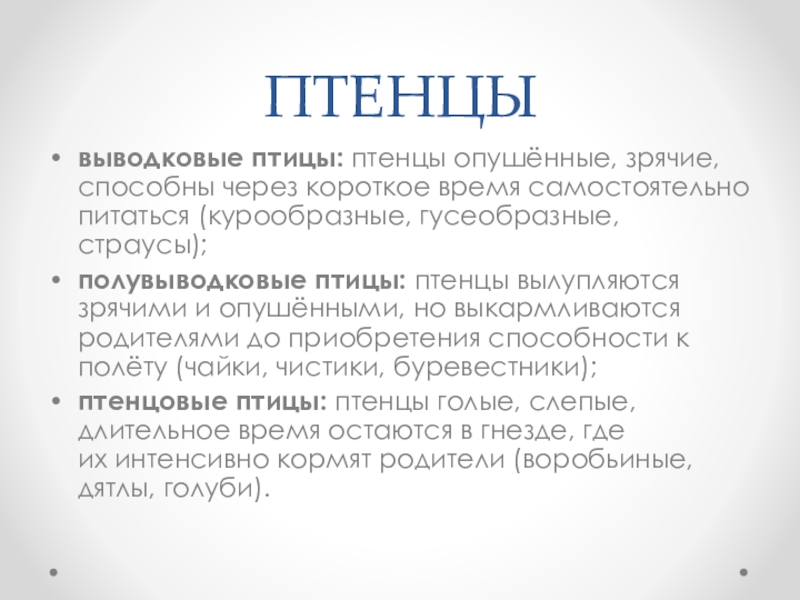 ПТЕНЦЫвыводковые птицы: птенцы опушённые, зрячие, способны через короткое время самостоятельно питаться (курообразные, гусеобразные, страусы); полувыводковые птицы: птенцы вылупляются зрячими и