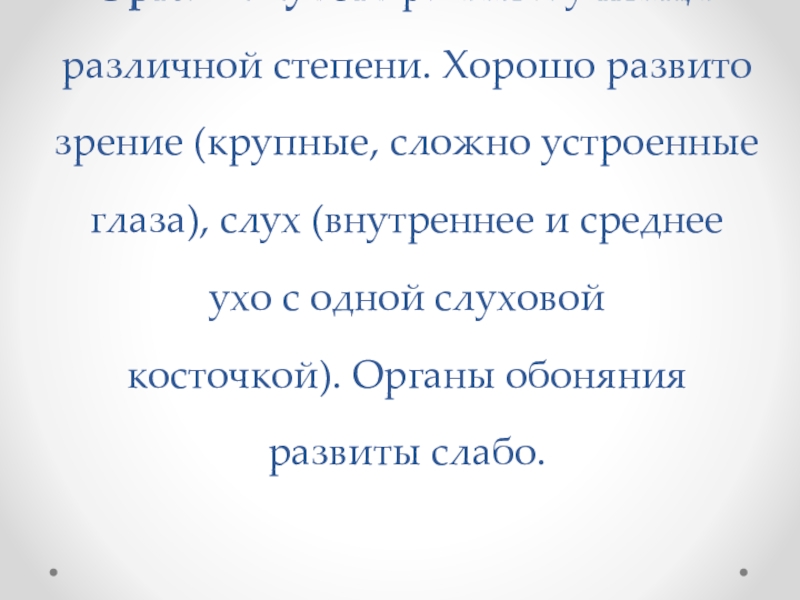 сложно устроенные глаза), слух (внутреннее и среднее ухо с одной слуховой косточкой). Органы обоняния развиты слабо.
