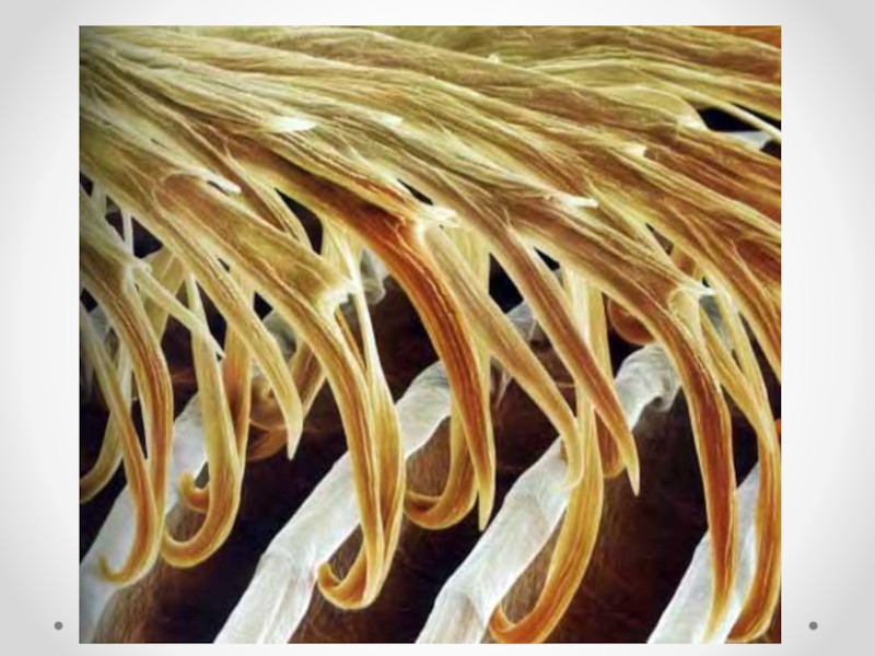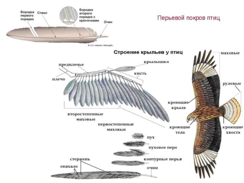 Перья — производные эпидермиса, образованы роговым веществом — кератином; эволюционно произошли от роговых чешуй пресмыкающихся.