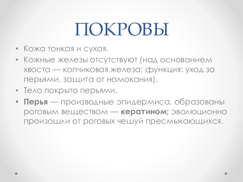 ПОКРОВЫКожа тонкая и сухая.Кожные железы отсутствуют (над основанием хвоста — копчиковая железа; функция: уход за перьями, защита