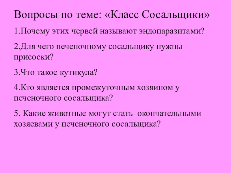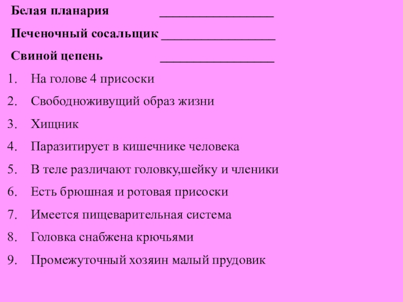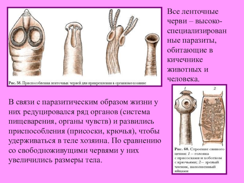 В связи с паразитическим образом жизни у них редуцировался ряд органов (система пищеварения, органы чувств) и развились приспособления (присоски, крючья), чтобы удерживаться в теле хозяина. По сравнению со свободноживущими червями у них увеличились размеры тела.