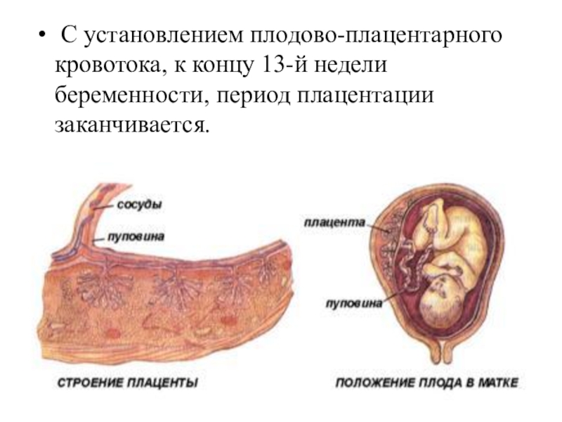 Слайд 13 С установлением плодово-плацентарного кровотока, к концу 13-й недели беременности, период плацентации