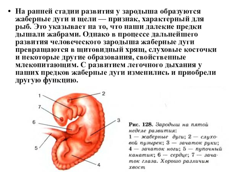 — признак, характерный для рыб. Это указывает на то, что наши далекие предки дышали жабрами. Однако в процессе дальнейшего развития человеческого зародыша жаберные дуги превращаются в щитовидный хрящ, слуховые косточки и некоторые другие образования, свойственные млекопитающим. С развитием легочного дыхания у наших предков жаберные дуги изменились и приобрели другую функцию.