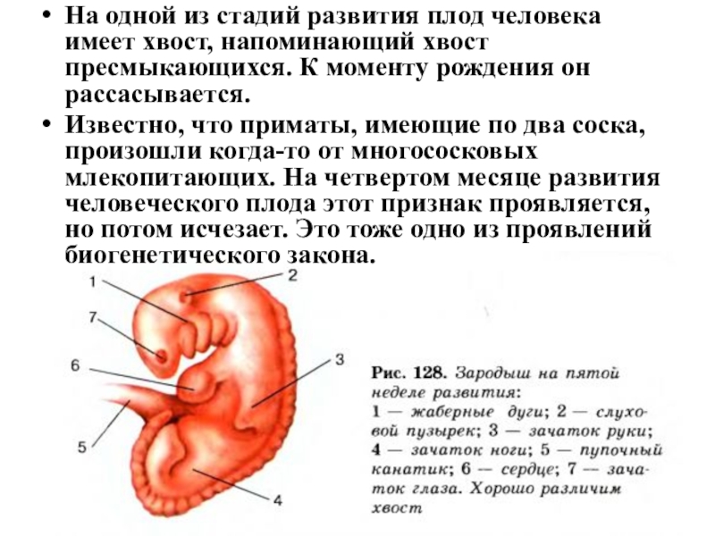 Слайд 6На одной из стадий развития плод человека имеет хвост, напоминающий хвост
