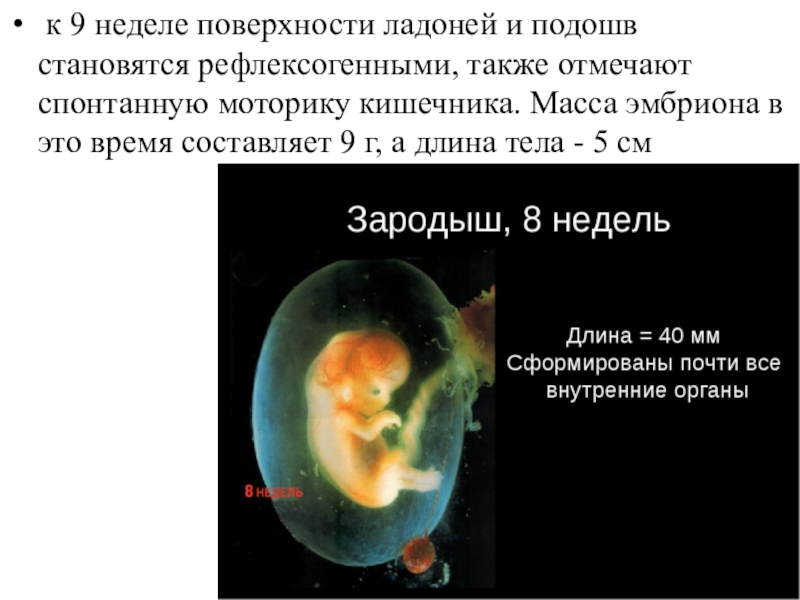 Слайд 12 к 9 неделе поверхности ладоней и подошв становятся рефлексогенными, также отмечают