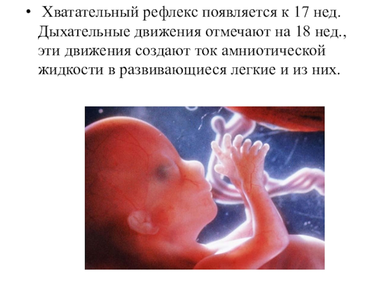 Слайд 15 Хватательный рефлекс появляется к 17 нед. Дыхательные движения отмечают на 18