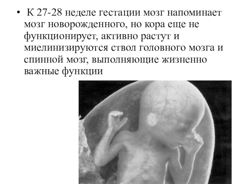 Слайд 16 К 27-28 неделе гестации мозг напоминает мозг новорожденного, но кора еще