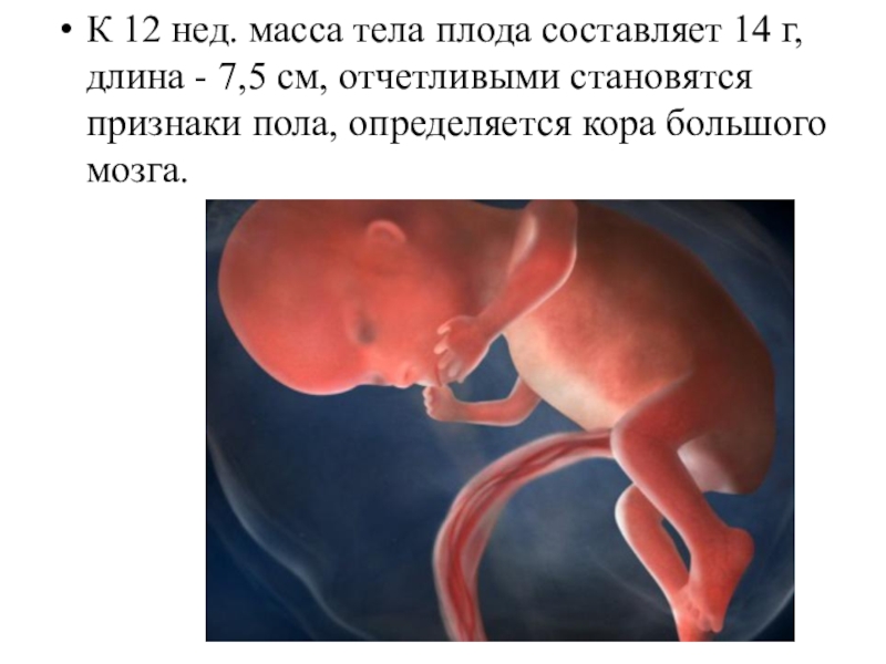 Слайд 14К 12 нед. масса тела плода составляет 14 г, длина -