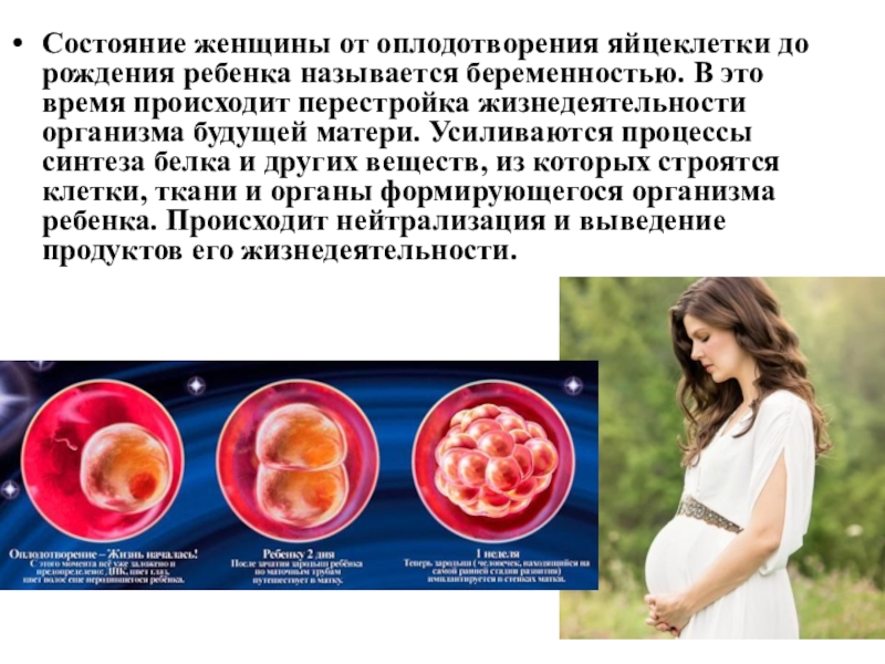 Слайд 7Состояние женщины от оплодотворения яйцеклетки до рождения ребенка называется беременностью. В это время