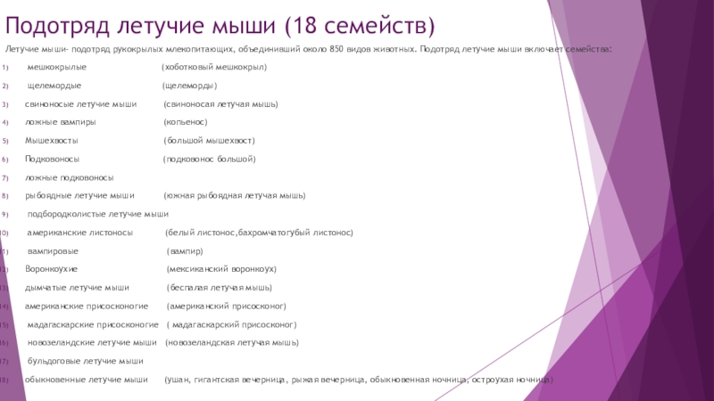 Слайд 12Подотряд летучие мыши (18 семейств)