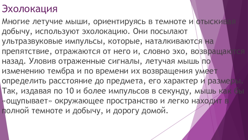 Они посылают ультразвуковые импульсы, которые, наталкиваются на препятствие, отражаются от него и, словно эхо, возвращаются назад. Уловив отраженные сигналы, летучая мышь по изменению тембра и по времени их возвращения умеет определить расстояние до предмета, его характер и размеры. Так, издавая по 10 и более импульсов в секунду, мышь как бы «ощупывает» окружающее пространство и легко находит в полной темноте и добычу, и дорогу домой.