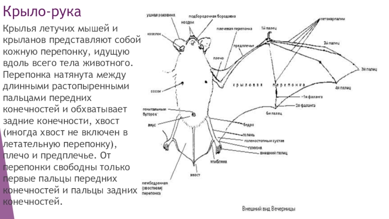 Крылья летучих мышей и крыланов представляют собой кожную перепонку, идущую вдоль