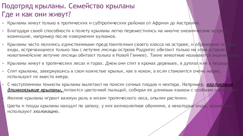 Крыланы часто являлись единственными представителями своего класса на острове, и образовали особые виды, встречающиеся только там ( летучие лисицы острова Родригес обитают только на этом острове; новогвинейские летучие лисицы обитают только в Новой Гвинее). Такие животные называются эндемиками.