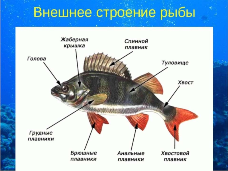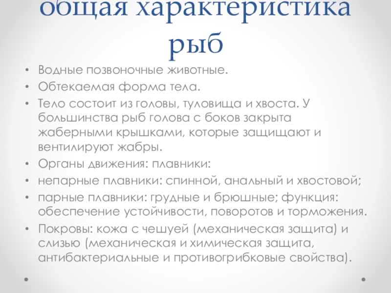 общая характеристика рыбВодные позвоночные животные.Обтекаемая форма тела.Тело состоит из головы, туловища и хвоста. У большинства рыб голова с