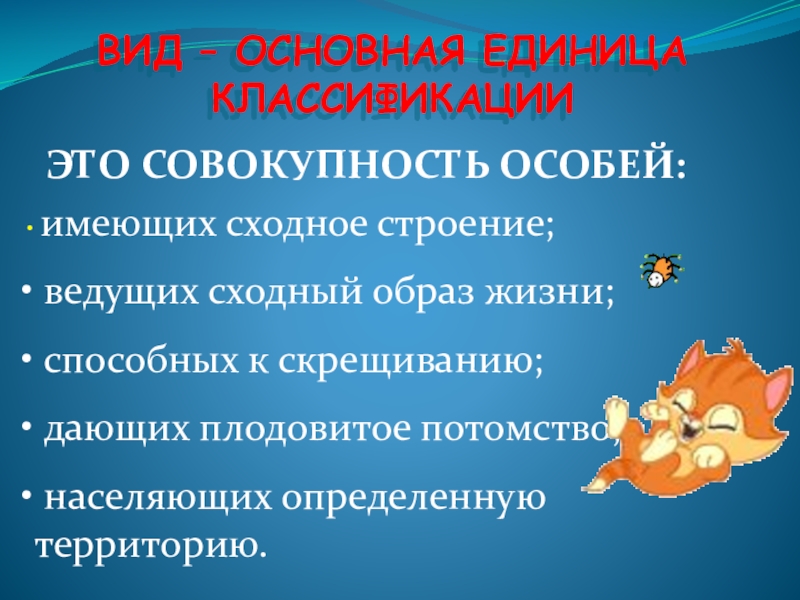 ВИД – ОСНОВНАЯ ЕДИНИЦА КЛАССИФИКАЦИИ ЭТО СОВОКУПНОСТЬ ОСОБЕЙ: имеющих сходное строение; ведущих сходный образ жизни; способных к