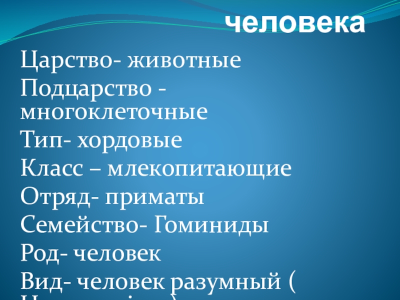 Систематика человекаЦарство- животныеПодцарство - многоклеточныеТип- хордовыеКласс – млекопитающиеОтряд- приматыСемейство- ГоминидыРод- человекВид- человек разумный ( Homo sapiens)
