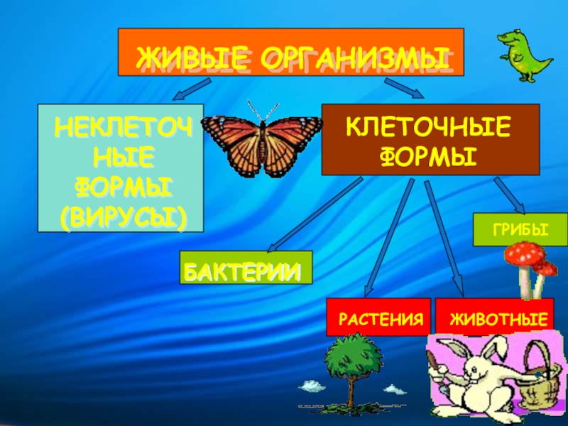 ЖИВЫЕ ОРГАНИЗМЫНЕКЛЕТОЧНЫЕ ФОРМЫ (ВИРУСЫ)КЛЕТОЧНЫЕ ФОРМЫБАКТЕРИИРАСТЕНИЯГРИБЫЖИВОТНЫЕ