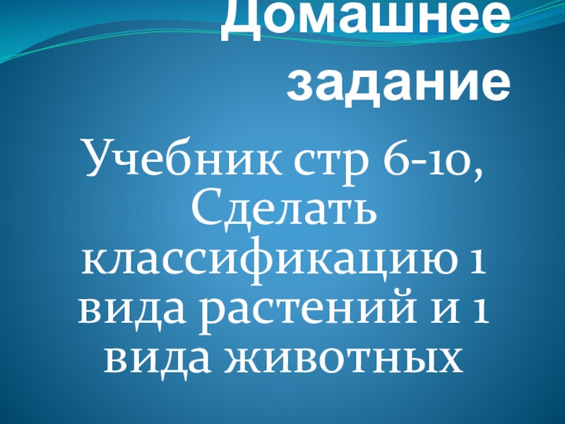 Домашнее заданиеУчебник стр 6-10, Сделать классификацию 1 вида растений и 1 вида животных