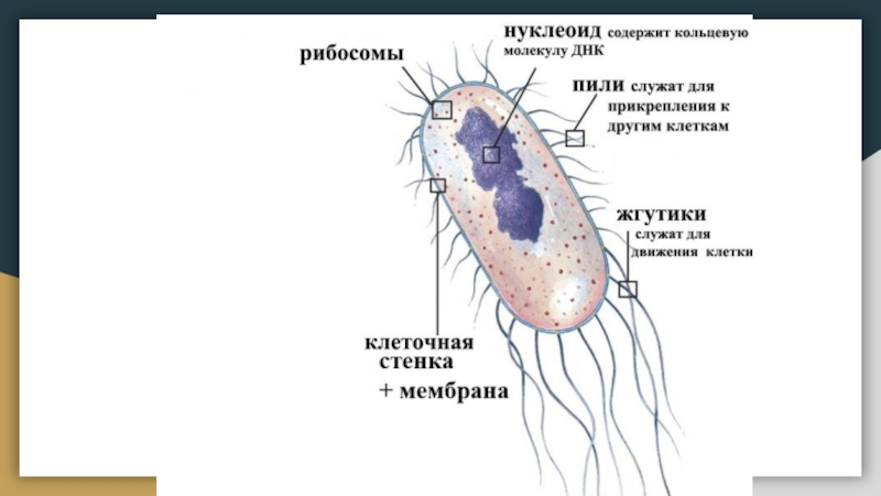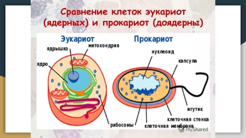 4) Клетка прокариот гораздо меньше клетки эукариот: по диаметру в 10 раз, по объему – в 1000 раз.