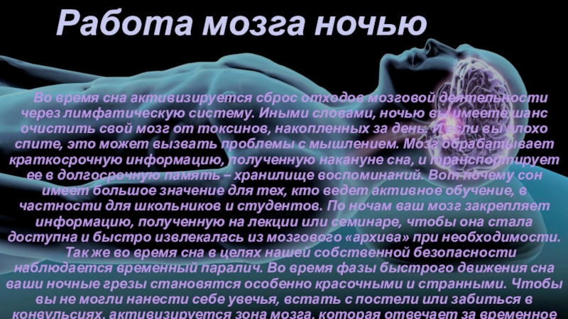 деятельности через лимфатическую систему. Иными словами, ночью вы имеете шанс очистить свой мозг от токсинов, накопленных за день. И если вы плохо спите, это может вызвать проблемы с мышлением. Мозг обрабатывает краткосрочную информацию, полученную накануне сна, и транспортирует ее в долгосрочную память – хранилище воспоминаний. Вот почему сон имеет большое значение для тех, кто ведет активное обучение, в частности для школьников и студентов. По ночам ваш мозг закрепляет информацию, полученную на лекции или семинаре, чтобы она стала доступна и быстро извлекалась из мозгового «архива» при необходимости.