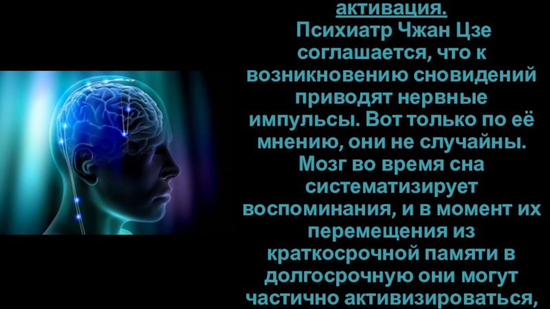 сновидений приводят нервные импульсы. Вот только по её мнению, они не случайны. Мозг во время сна систематизирует воспоминания, и в момент их перемещения из краткосрочной памяти в долгосрочную они могут частично активизироваться, и мы видим сновидения.