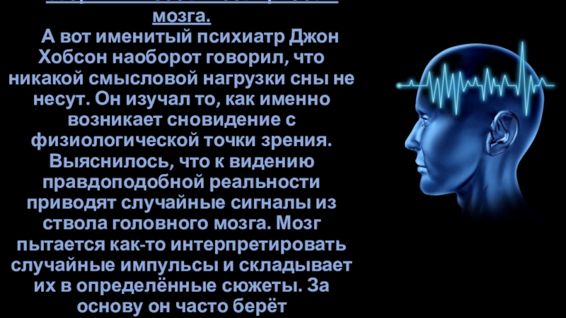 психиатр Джон Хобсон наоборот говорил, что никакой смысловой нагрузки сны не несут. Он изучал то, как именно возникает сновидение с физиологической точки зрения. Выяснилось, что к видению правдоподобной реальности приводят случайные сигналы из ствола головного мозга. Мозг пытается как-то интерпретировать случайные импульсы и складывает их в определённые сюжеты. За основу он часто берёт воспоминания.