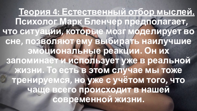 Марк Бленчер предполагает, что ситуации, которые мозг моделирует во сне, позволяют ему выбирать наилучшие эмоциональные реакции. Он их запоминает и использует уже в реальной жизни. То есть в этом случае мы тоже тренируемся, но уже с учётом того, что чаще всего происходит в нашей современной жизни.