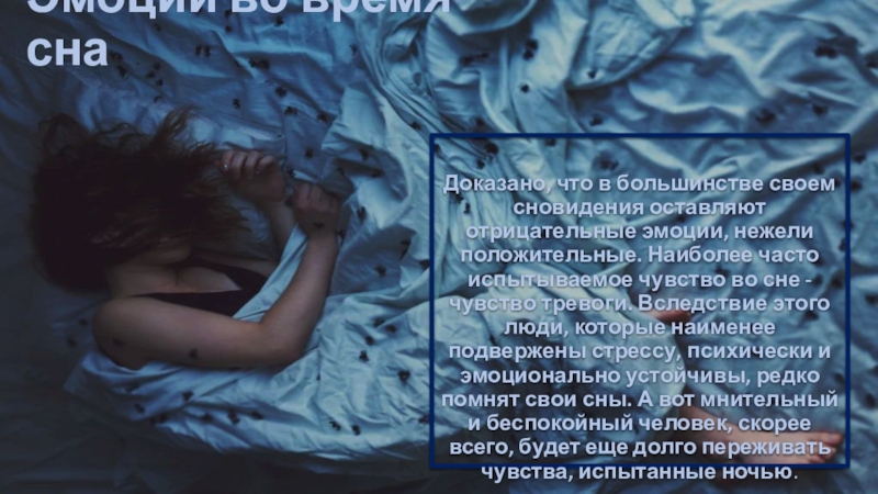 эмоции, нежели положительные. Наиболее часто испытываемое чувство во сне - чувство тревоги. Вследствие этого люди, которые наименее подвержены стрессу, психически и эмоционально устойчивы, редко помнят свои сны. А вот мнительный и беспокойный человек, скорее всего, будет еще долго переживать чувства, испытанные ночью.