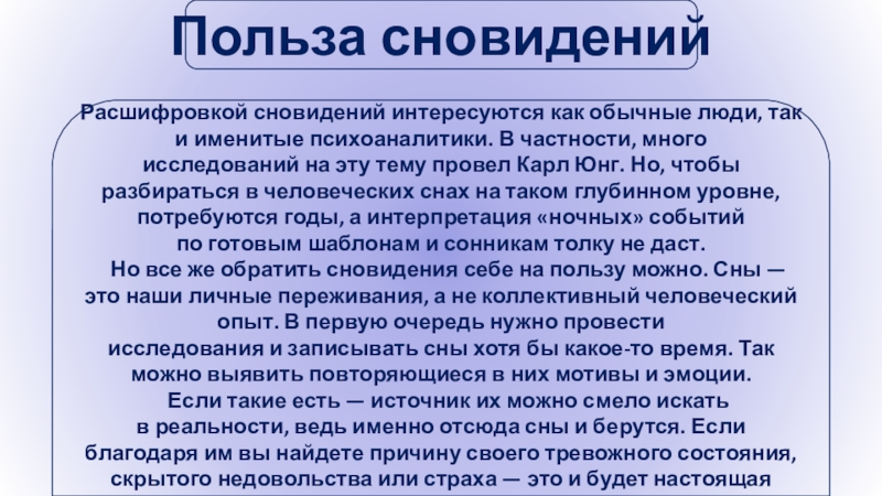 исследований на эту тему провел Карл Юнг. Но, чтобы разбираться в человеческих снах на таком глубинном уровне, потребуются годы, а интерпретация «ночных» событий по готовым шаблонам и сонникам толку не даст.