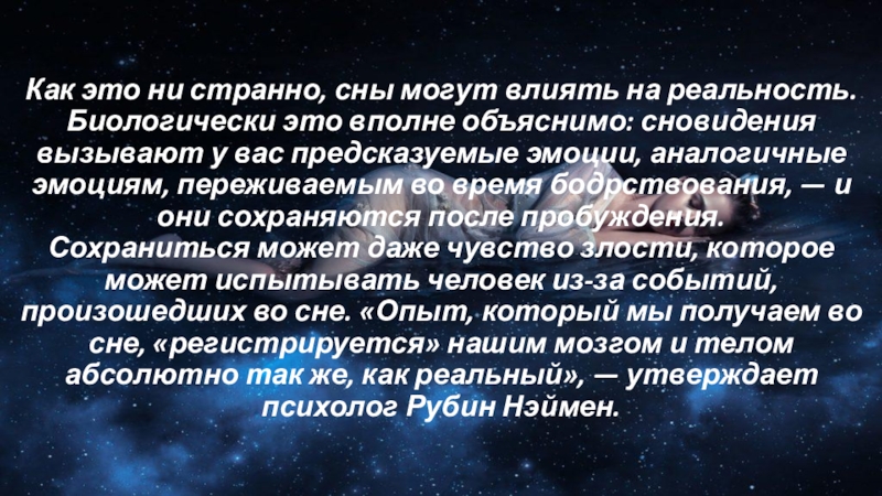 Слайд 23Как это ни странно, сны могут влиять на реальность. Биологически это