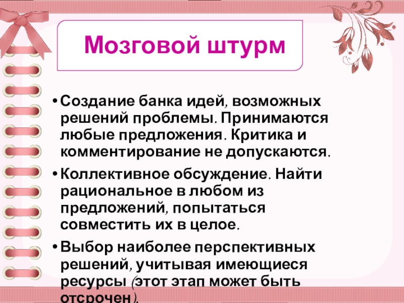 Создание банка идей, возможных решений проблемы. Принимаются любые предложения. Критика