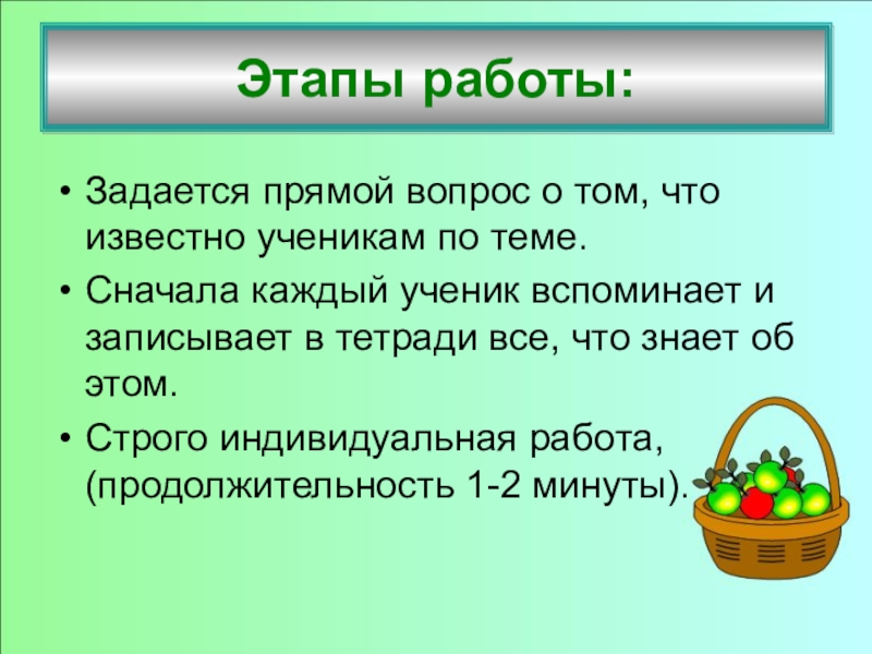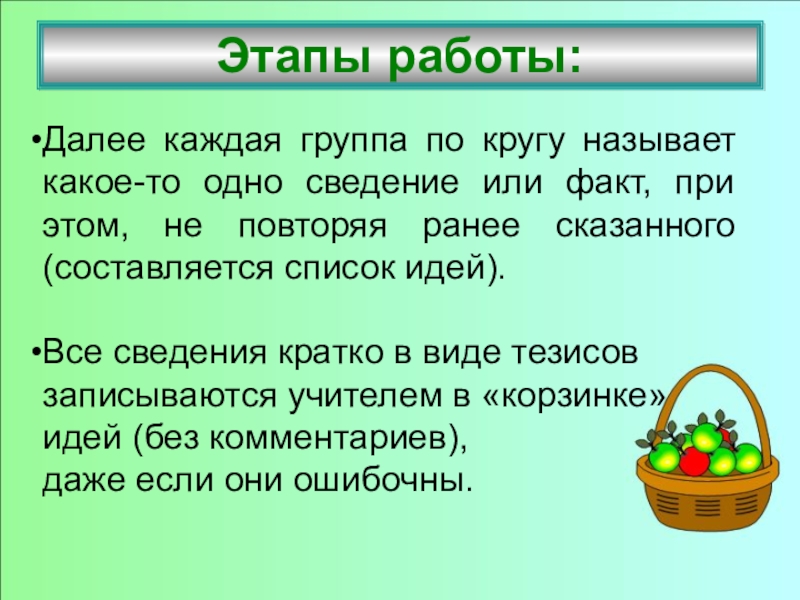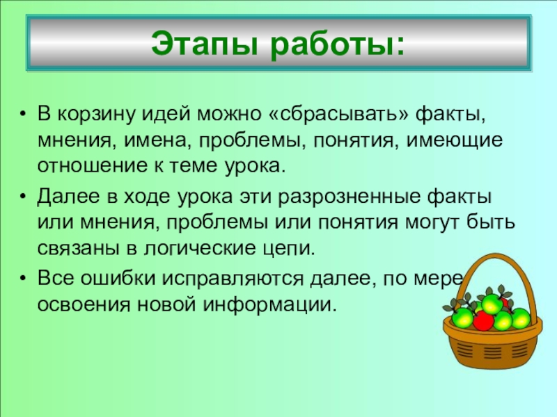 Все сведения кратко в виде тезисов записываются учителем в «корзинке» идей (без комментариев), даже если они ошибочны.