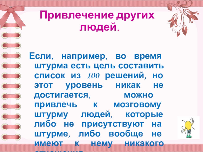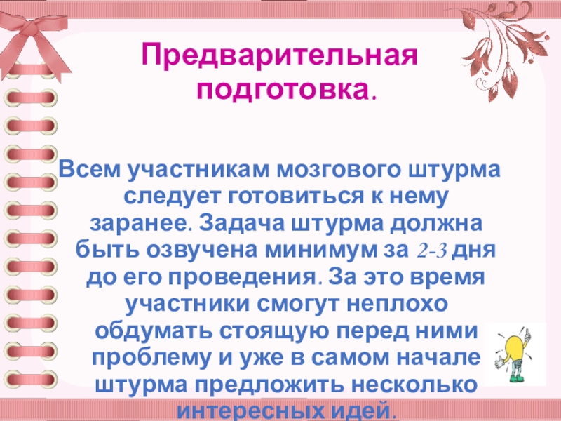 Всем участникам мозгового штурма следует готовиться к нему заранее. Задача