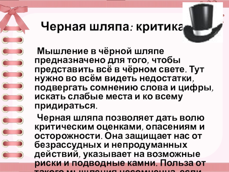 чёрной шляпе предназначено для того, чтобы представить всё в чёрном свете. Тут нужно во всём видеть недостатки, подвергать сомнению слова и цифры, искать слабые места и ко всему придираться.