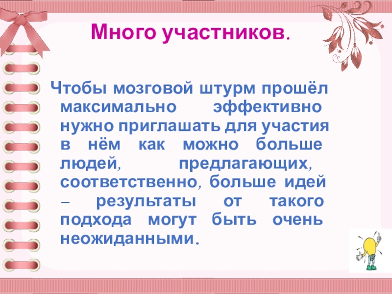 участия в нём как можно больше людей, предлагающих, соответственно, больше идей – результаты от такого подхода могут быть очень неожиданными.