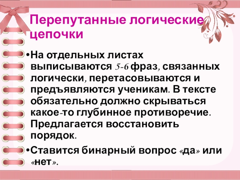На отдельных листах выписываются 5-6 фраз, связанных логически, перетасовываются