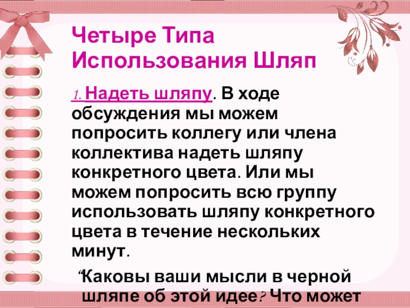 тип мышления мы собираемся использовать. Например, иногда нужно что-то сказать, но это трудно сделать, не обидев кого-то. Просто сказав, что надеваете черную шляпу, вы получаете возможность обсуждать идею, не нападая на человека, предложившего ее. Используйте шляпы сами – и указывайте на то, что их используйте, обучая шляпам других