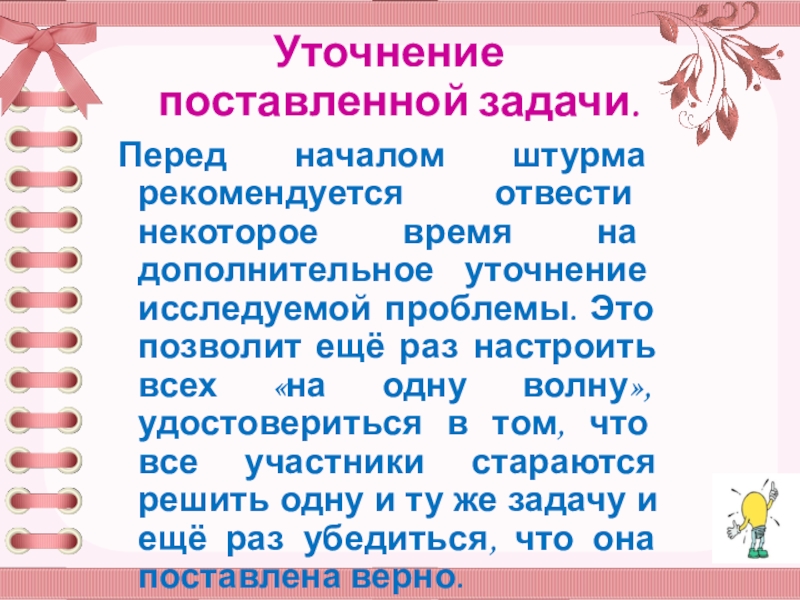дополнительное уточнение исследуемой проблемы. Это позволит ещё раз настроить всех «на одну волну», удостовериться в том, что все участники стараются решить одну и ту же задачу и ещё раз убедиться, что она поставлена верно.