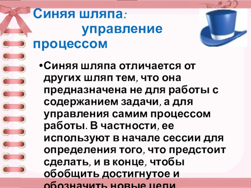 Синяя шляпа отличается от других шляп тем, что она предназначена не для работы с содержанием задачи, а для управления самим процессом работы. В частности, ее используют в начале сессии для определения того, что предстоит сделать, и в конце, чтобы обобщить достигнутое и обозначить новые цели.