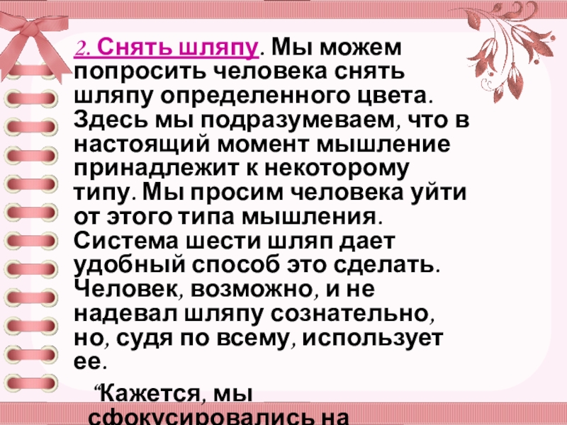 Здесь мы подразумеваем, что в настоящий момент мышление принадлежит к некоторому типу. Мы просим человека уйти от этого типа мышления. Система шести шляп дает удобный способ это сделать. Человек, возможно, и не надевал шляпу сознательно, но, судя по всему, использует ее.
