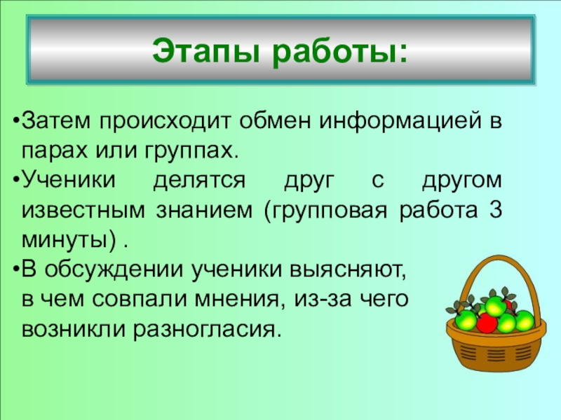 Затем происходит обмен информацией в парах или группах.