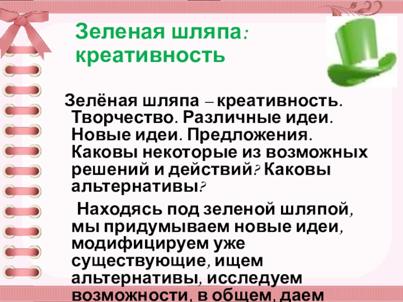 Зелёная шляпа – креативность. Творчество. Различные идеи. Новые идеи.
