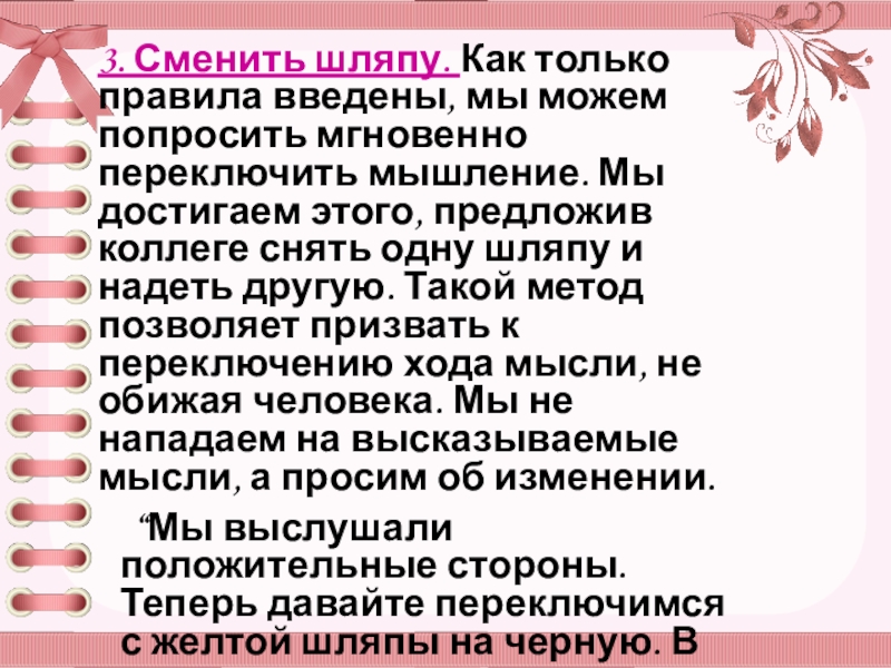 переключить мышление. Мы достигаем этого, предложив коллеге снять одну шляпу и надеть другую. Такой метод позволяет призвать к переключению хода мысли, не обижая человека. Мы не нападаем на высказываемые мысли, а просим об изменении.