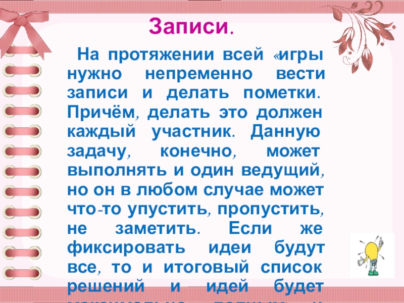 На протяжении всей «игры нужно непременно вести записи и делать