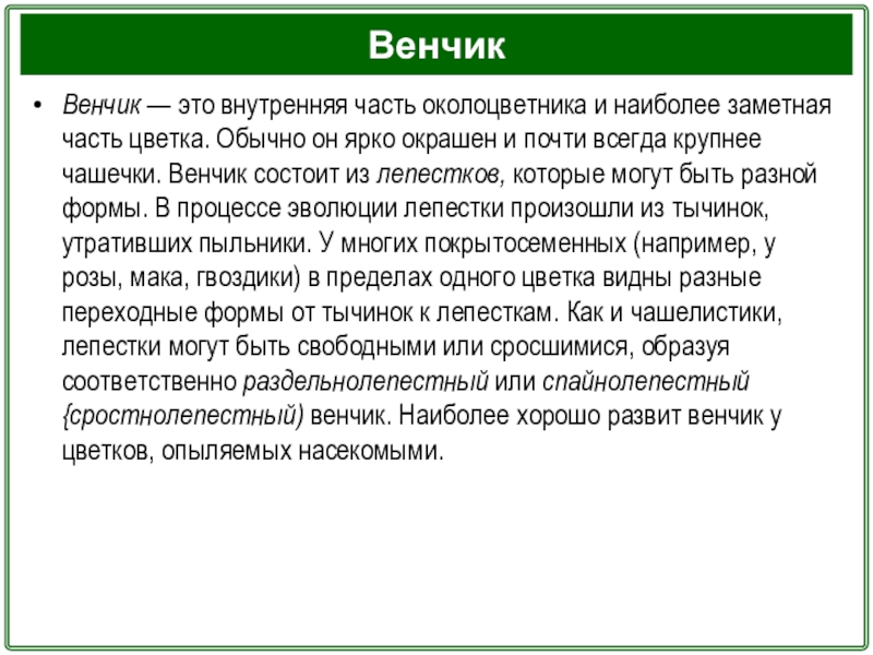 цветка. Обычно он ярко окрашен и почти всегда крупнее чашечки. Венчик состоит из лепестков, которые могут быть разной формы. В процессе эволюции лепестки произошли из тычинок, утративших пыльники. У многих покрытосеменных (например, у розы, мака, гвоздики) в пределах одного цветка видны разные переходные формы от тычинок к лепесткам. Как и чашелистики, лепестки могут быть свободными или сросшимися, образуя соответственно раздельнолепестный или спайнолепестный {сростнолепестный) венчик. Наиболее хорошо развит венчик у цветков, опыляемых насекомыми.