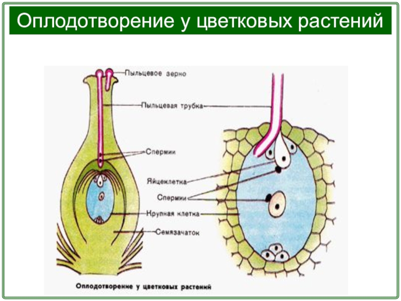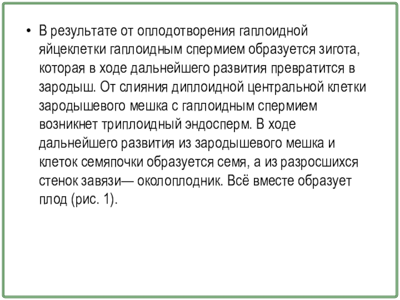 в ходе дальнейшего развития превратится в зародыш. От слияния диплоидной центральной клетки зародышевого мешка с гаплоидным спермием возникнет триплоидный эндосперм. В ходе дальнейшего развития из зародышевого мешка и клеток семяпочки образуется семя, а из разросшихся стенок завязи— околоплодник. Всё вместе образует плод (рис. 1).