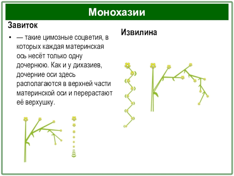 — такие цимозные соцветия, в которых каждая материнская ось несёт только