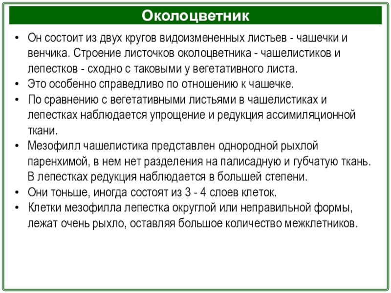 По сравнению с вегетативными листьями в чашелистиках и лепестках наблюдается упрощение и редукция ассимиляционной ткани.