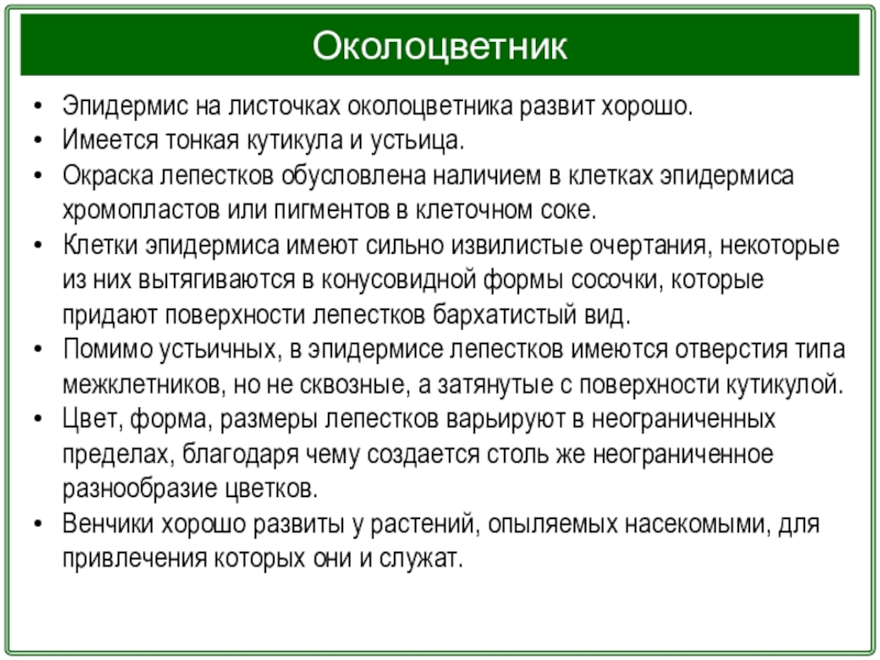 Клетки эпидермиса имеют сильно извилистые очертания, некоторые из них вытягиваются в конусовидной формы сосочки, которые придают поверхности лепестков бархатистый вид.